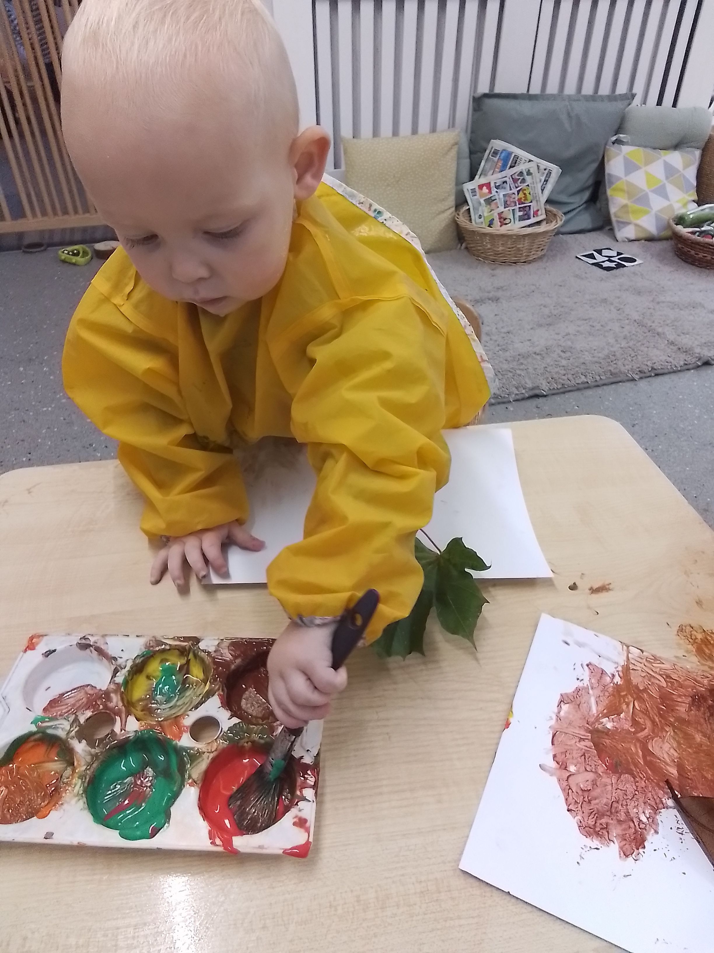 Leaf printing - looking at how the season changes our surroundings watching the leaves change colour from green to various shades of orange, red and brown adding paint into the mix enables us to explore colour even further.