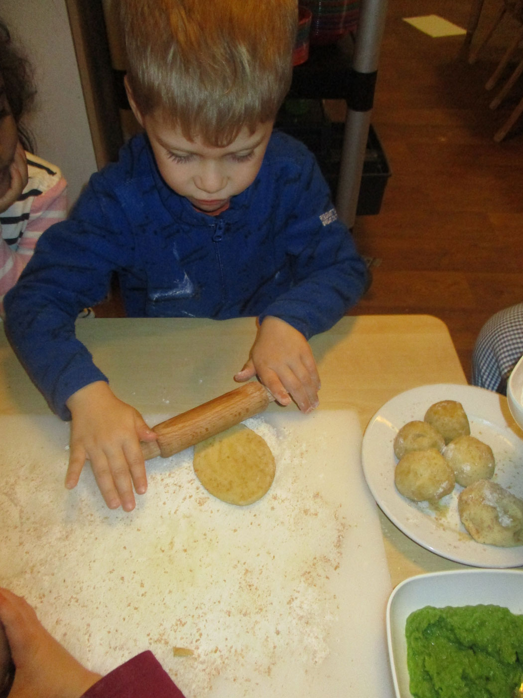 This month the children enjoyed helping Yannick make pea tarts: the children helped blend some peas and herbs together to make a paste, then they rolled out some pastry and made tarts.