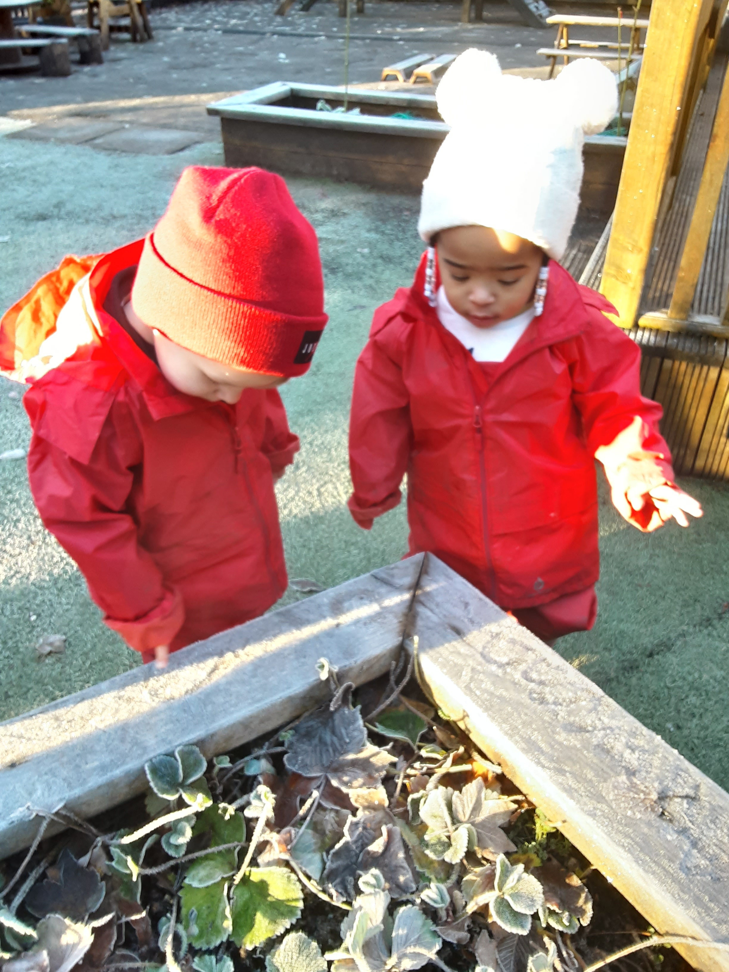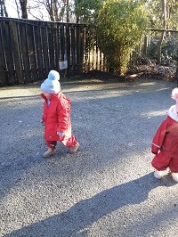 The toddlers have also loved playing outside in the cold today. Jack frost had definitely been out and about last night and we explored all the areas in the garden that were frozen. We touched the frost and made footprints on the ground we listened to the crunching leaves and practised lots of new words such as ‘frosty’ ‘frozen’ and ‘freezing’.