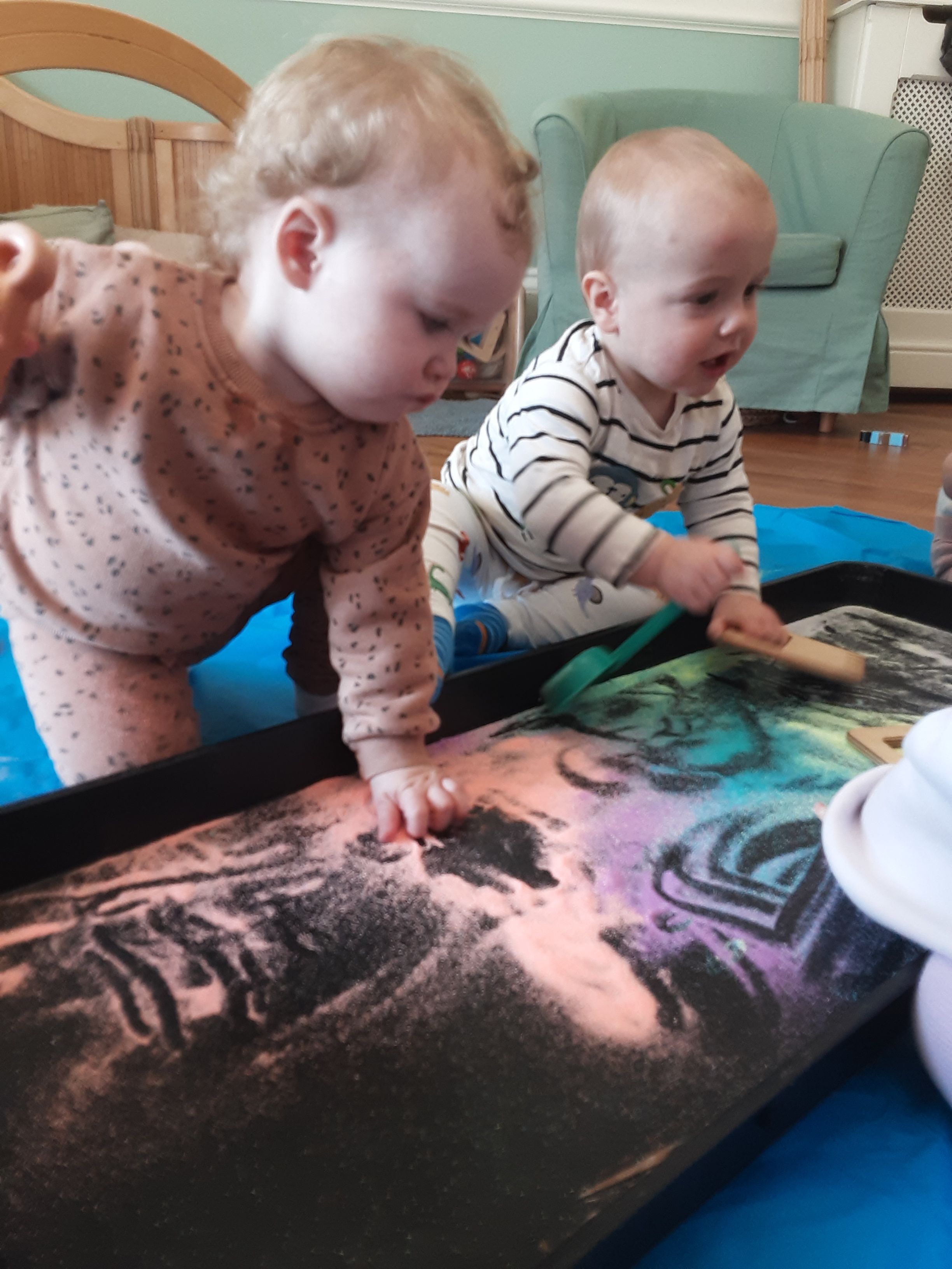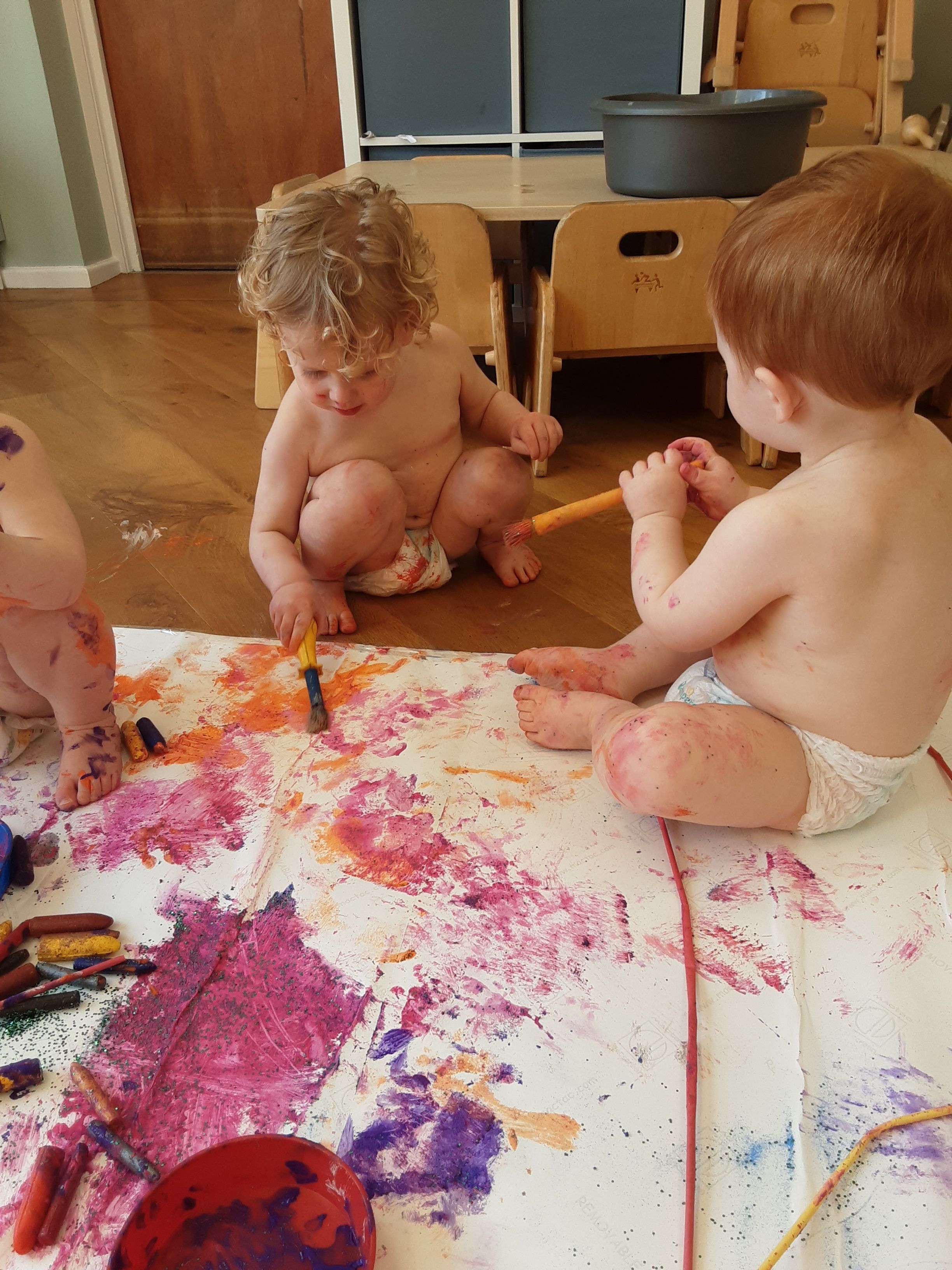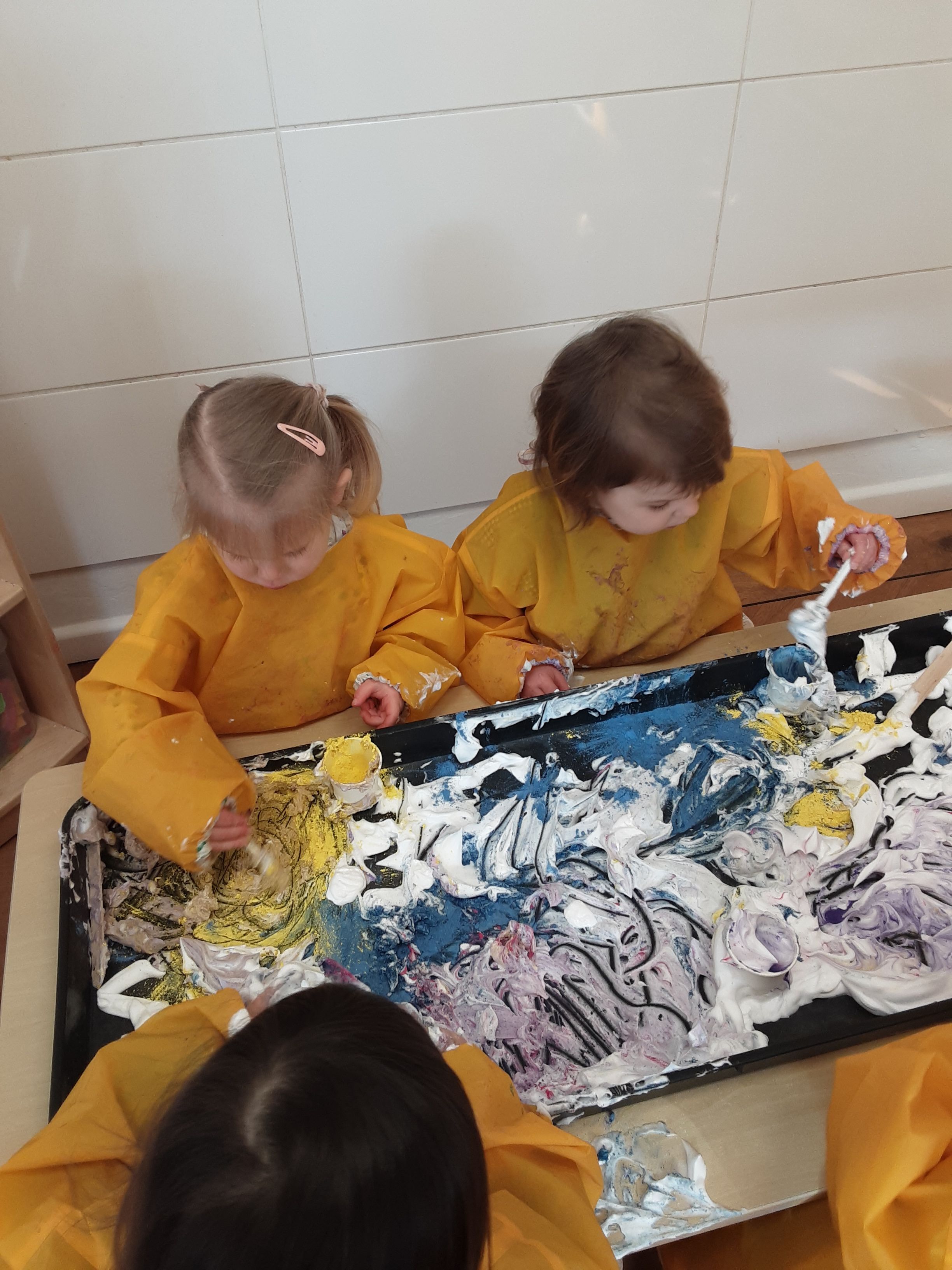 The babies fully emersed themselves in colour using their senses to explore colour through different arts and crafts they particularly enjoyed creating a giant mural with body art painting, colour mixing and patterns that they made, and looking at environments through transparent colour materials. Toddlers enjoyed experimenting with colour to create a wonderful shaving foam activity which they could make rainbows and practise colour mixing.