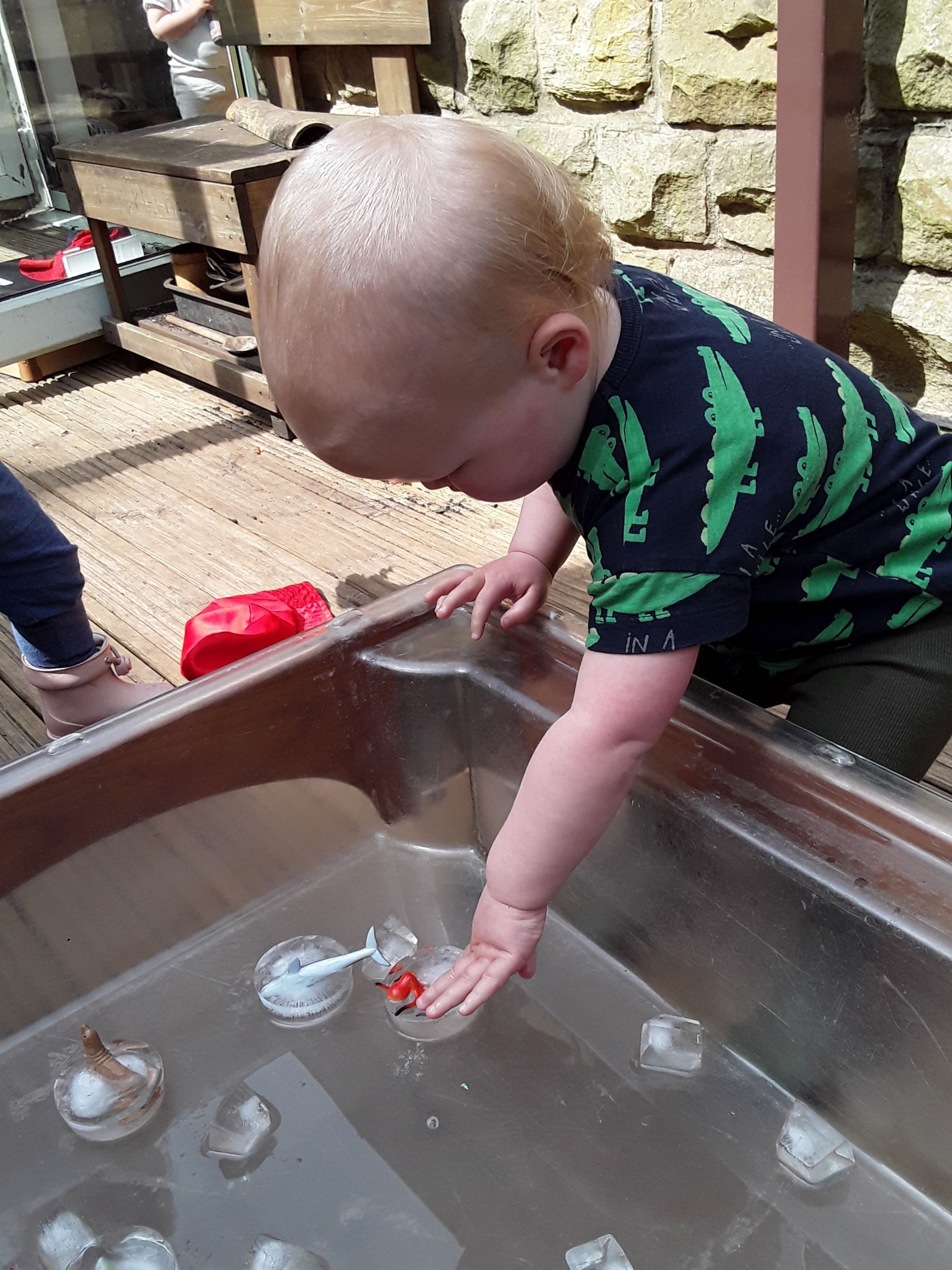 The Harlequin babies have explored and splashed in the water activities set up, focusing on words such as fish, splash, cold and wet. We found sticks and made fishing rods and went fishing. We had made some frozen cubes with sea creatures set into the ice, the frozen Sealife fascinated the children as they watched it drip and melt in the sun as they played. To end the day we made fish puppets with our hands and used them as we sang songs including '1, 2, 3, 4, 5 once I caught a fish alive' and 'Baby shark'