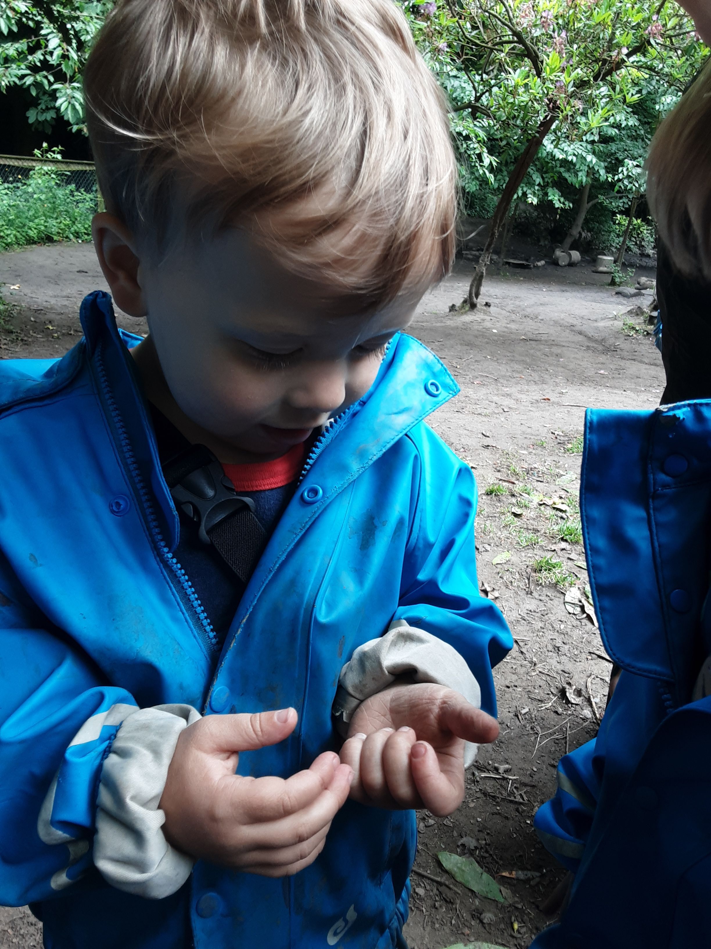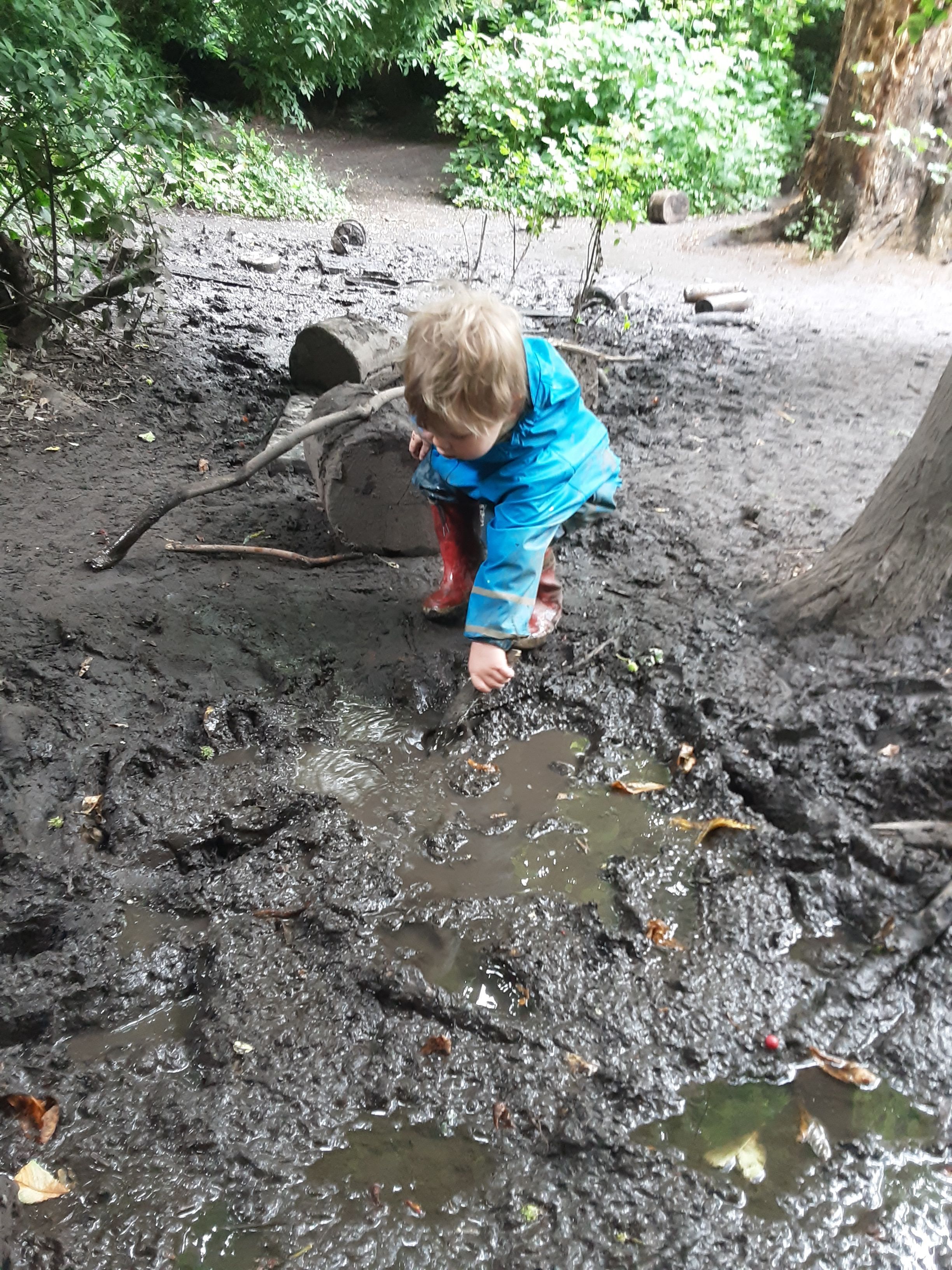 We also explored mud by jumping in large puddles, stomping through the jungle and squelching it with our wellies. It is also the perfect place to find insects, this morning we found lots of wiggly worms and ladybirds. We treated them with care saying hello then placing them back where we found them in the cool mud.