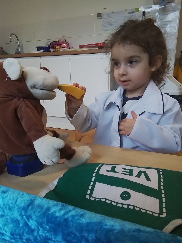 To finish off the day, we set up a “vets” in pre-school where the children could feed and care for their pets, “wash” them, and even “walk” them around the room. This activity encouraged imaginative play and also helped the children practice important social skills like sharing and taking turns and introducing narrative into play.