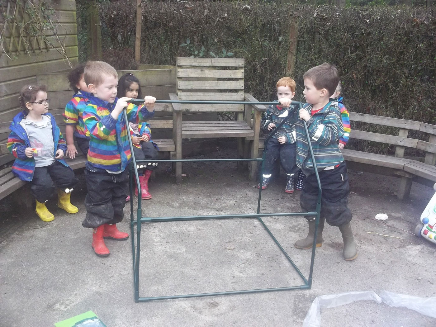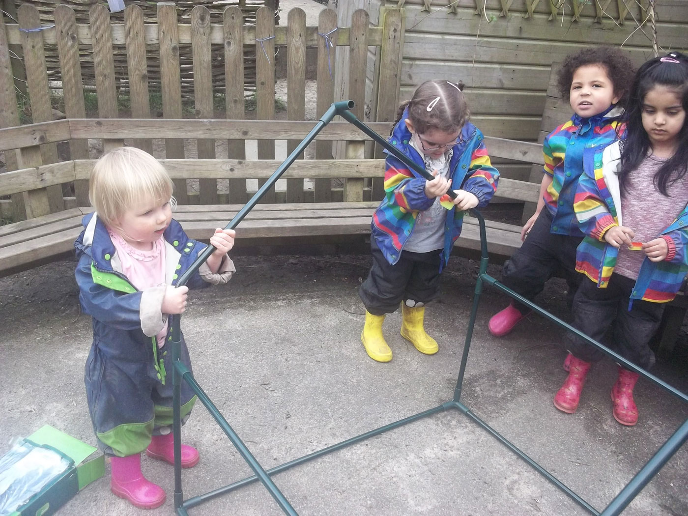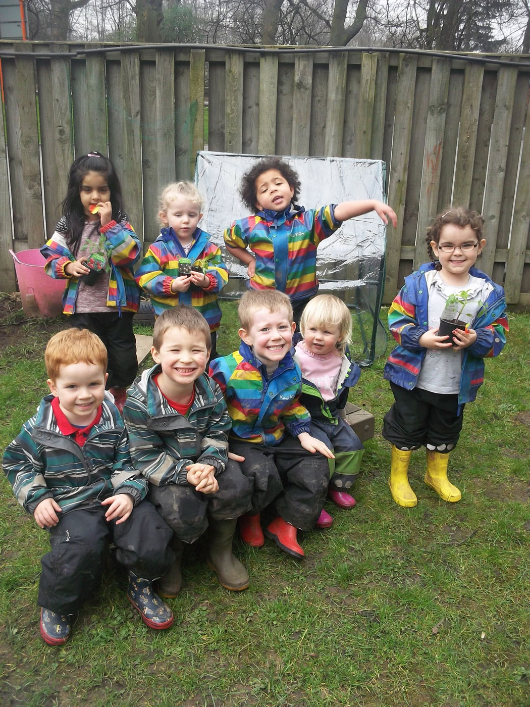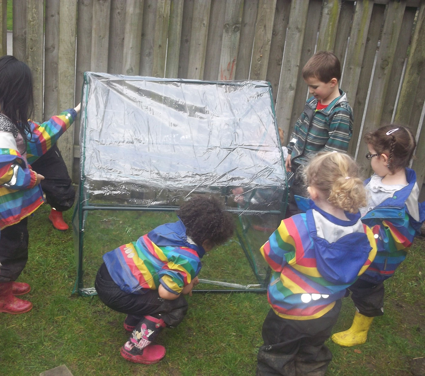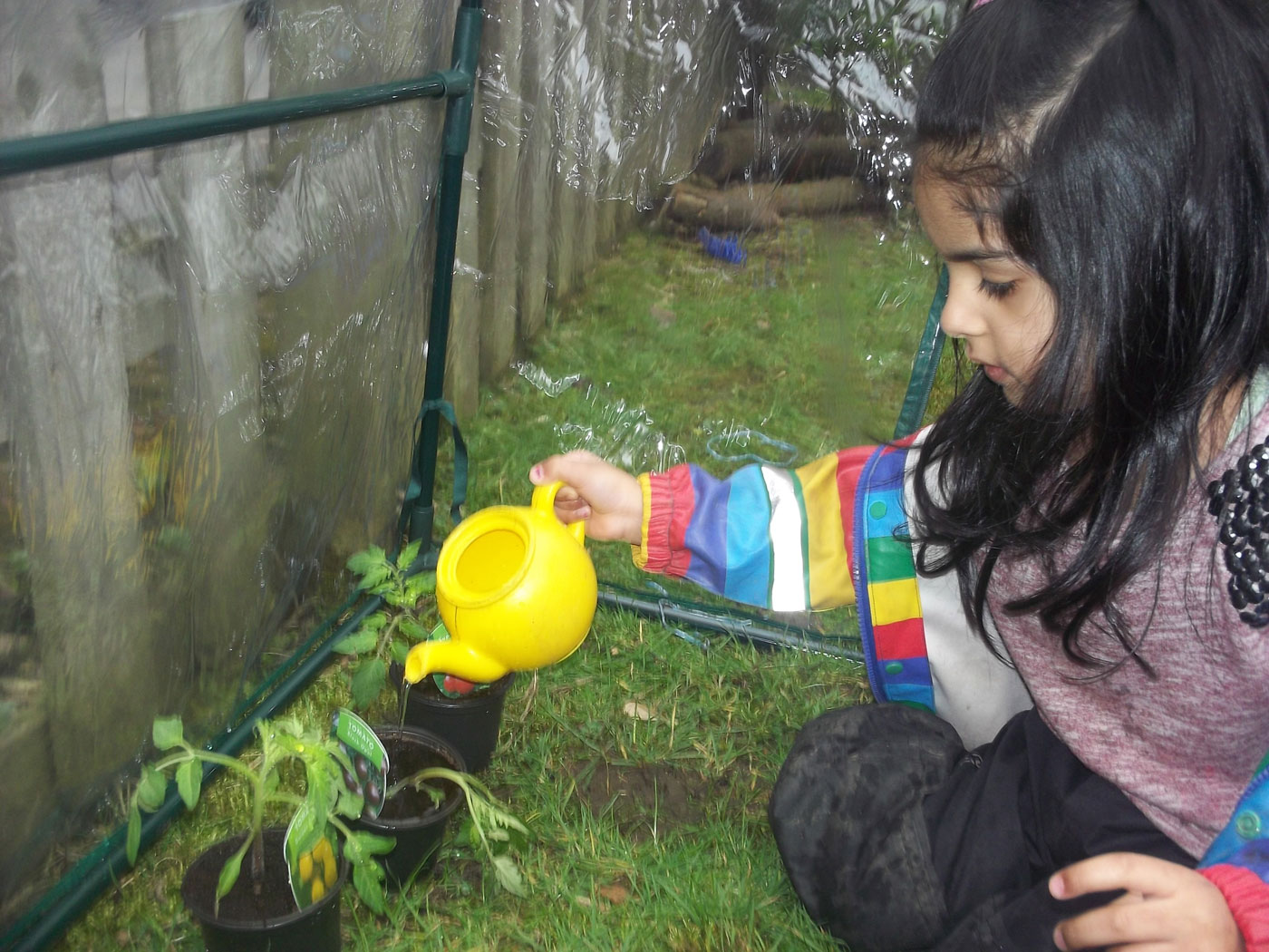 When built, the children discussed how it looks like a very small house, they began to recite “old man won’t you help me please my house is a squash and a squeeze” from one of our favourite story books. We even counted how many children could fit inside our house! We watered our tomato plants and zipped up the greenhouse to keep them safe and warm. We are very excited to see the different coloured tomatoes growing!