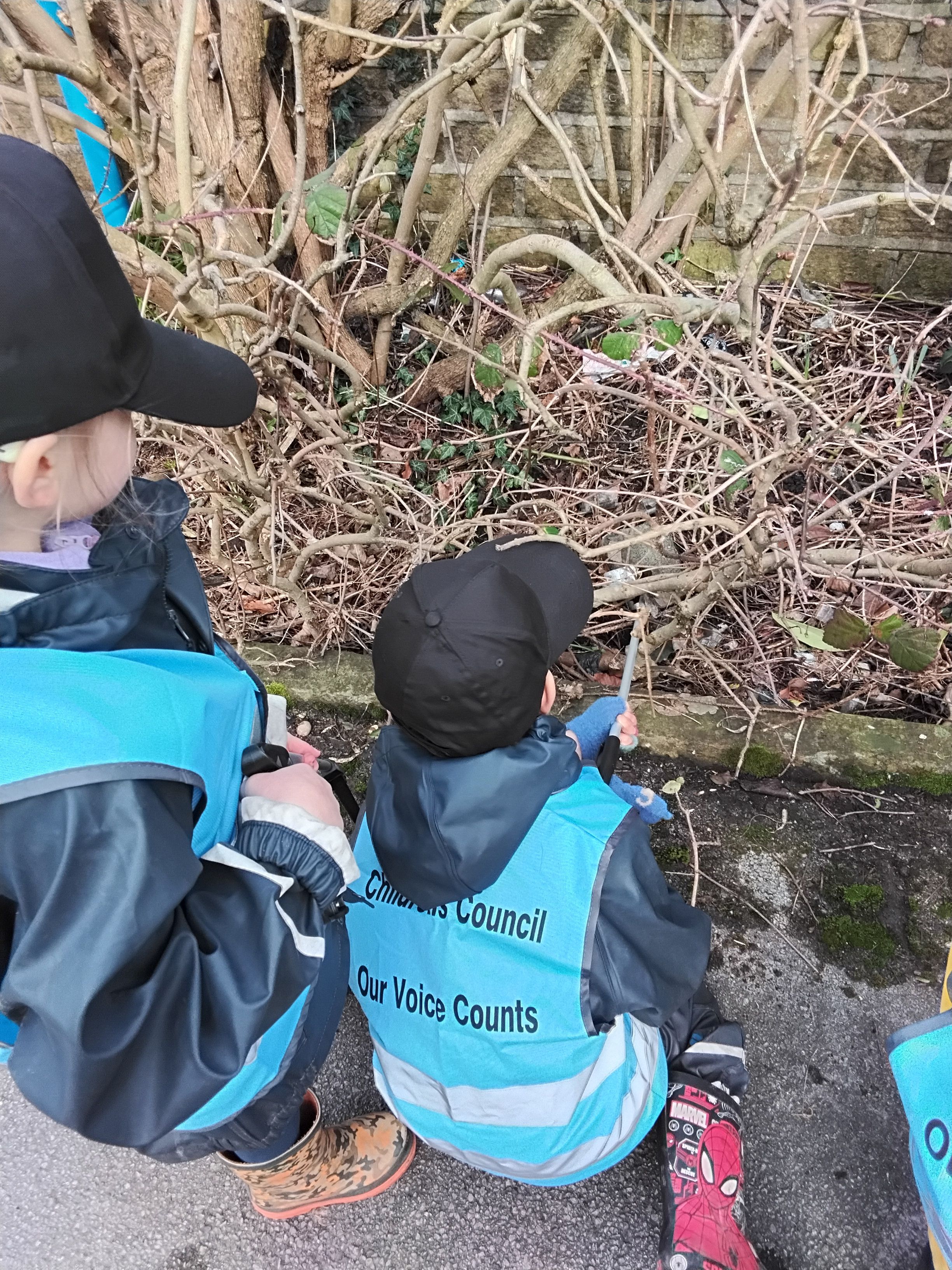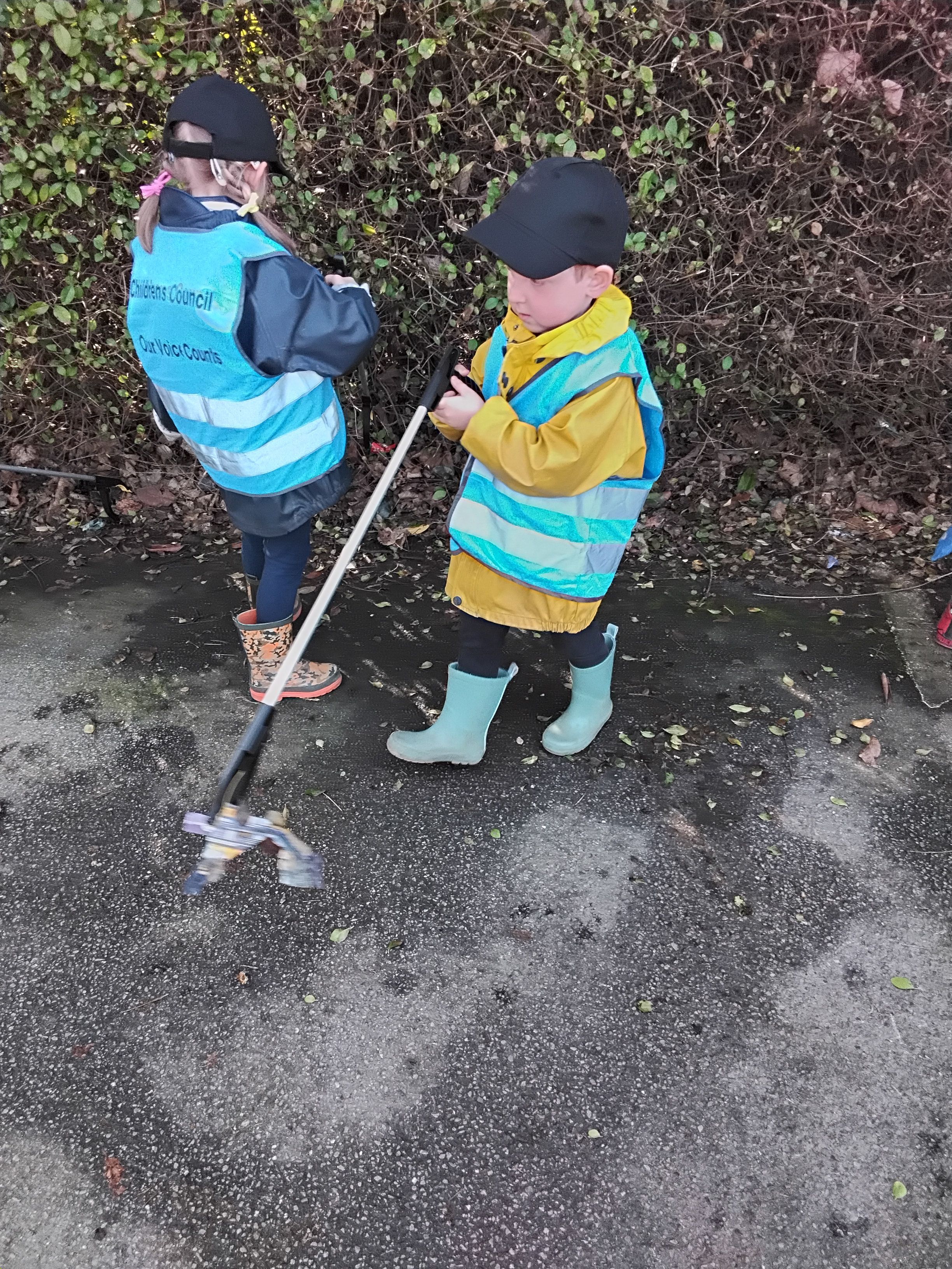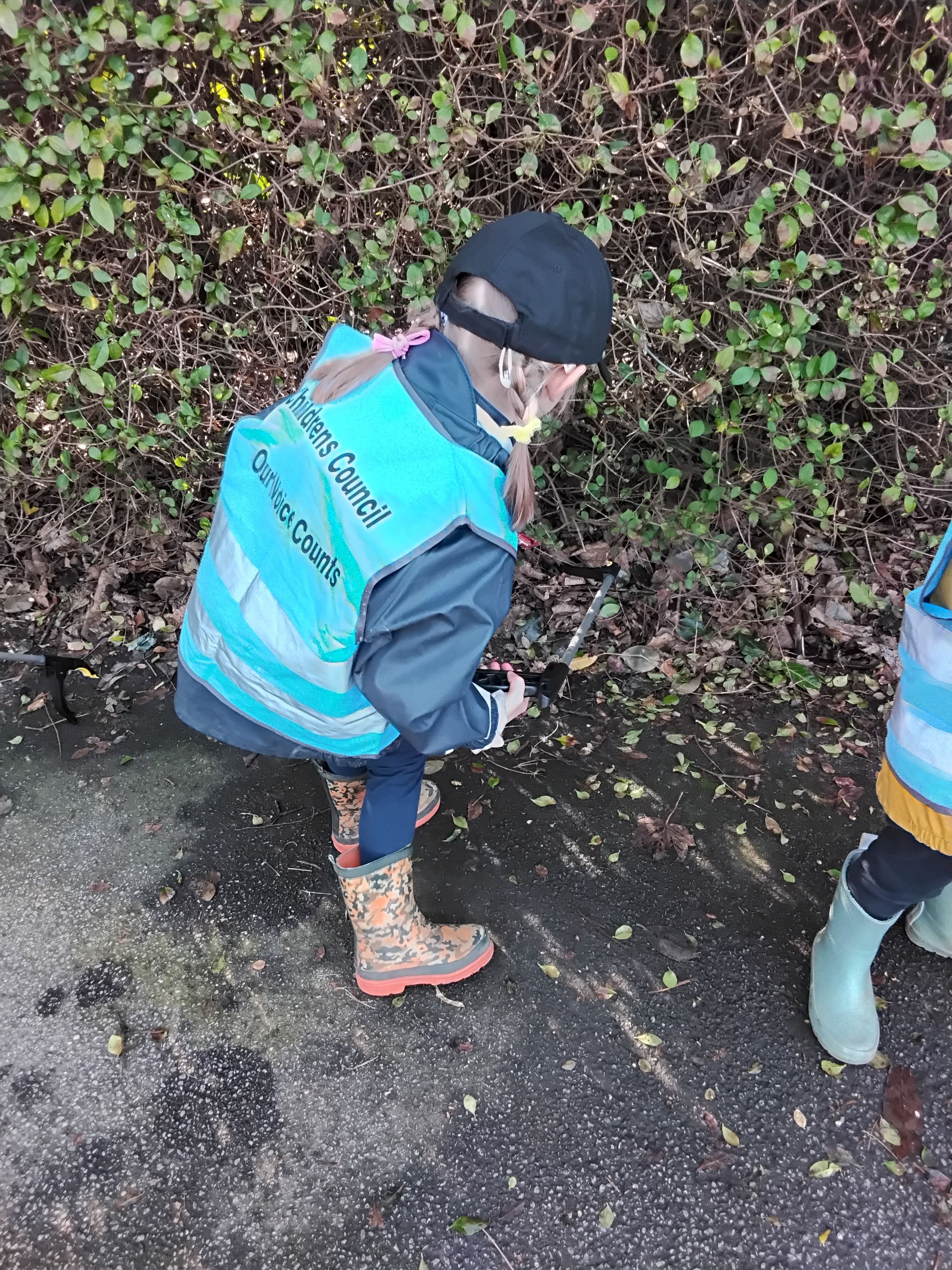 As they entered the car park Martha and Oscar talked about how to make the area safe. They made a plan to close the big gate to keep out the traffic so everyone remained safe, Muhammad had the important job of checking to ensure it was closed and did an excellent job. When the area was agreed to be safe, the council started their task using the litter picker tools to remove the rubbish from underneath the bushes. They identified a bit of a problem at one side of the car park as they struggled to reach the rubbish! They discussed how they could reach to the back of the bushes and decided to ask for some longer handled pickers. When they had finished their task the bucket was practically full and went into the rubbish bin ready to be collected and start its waste disposal journey.