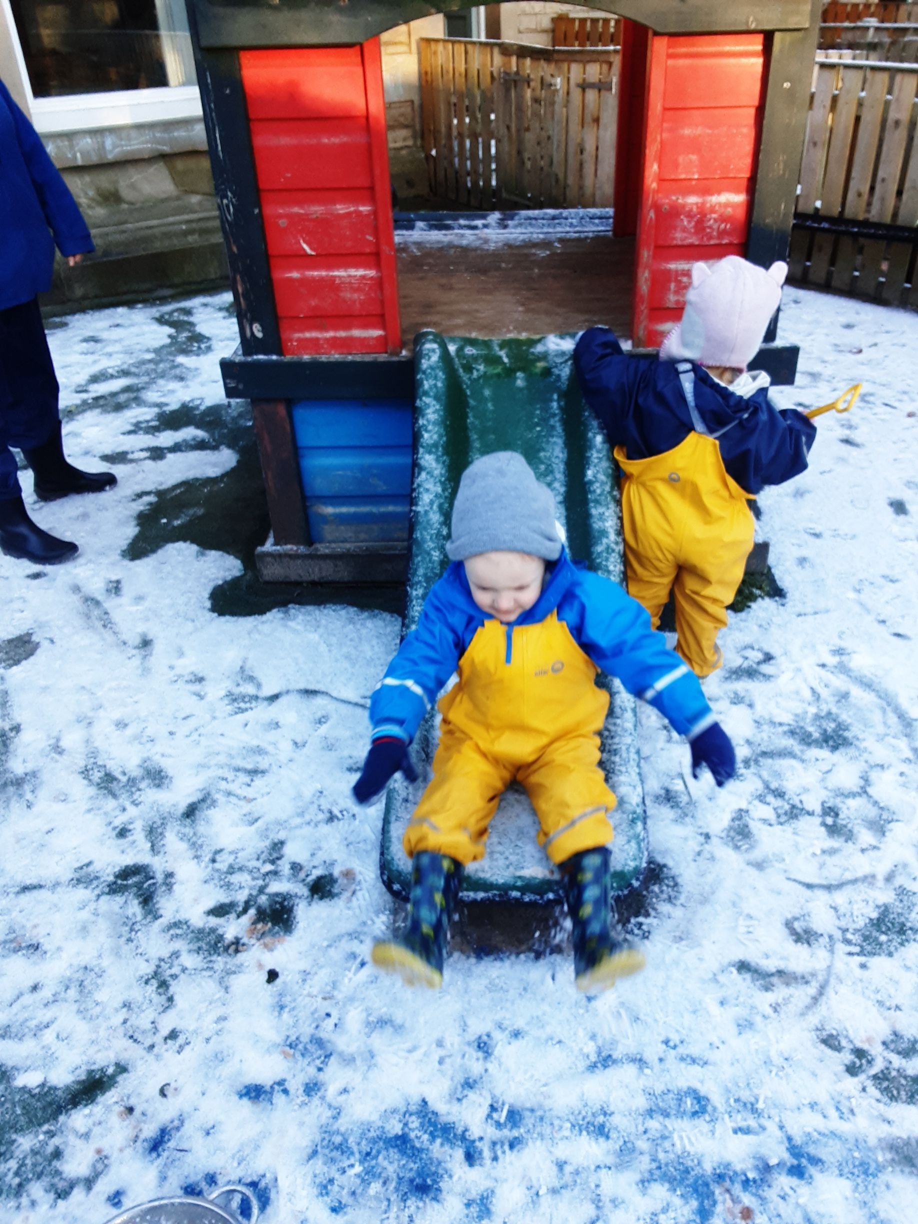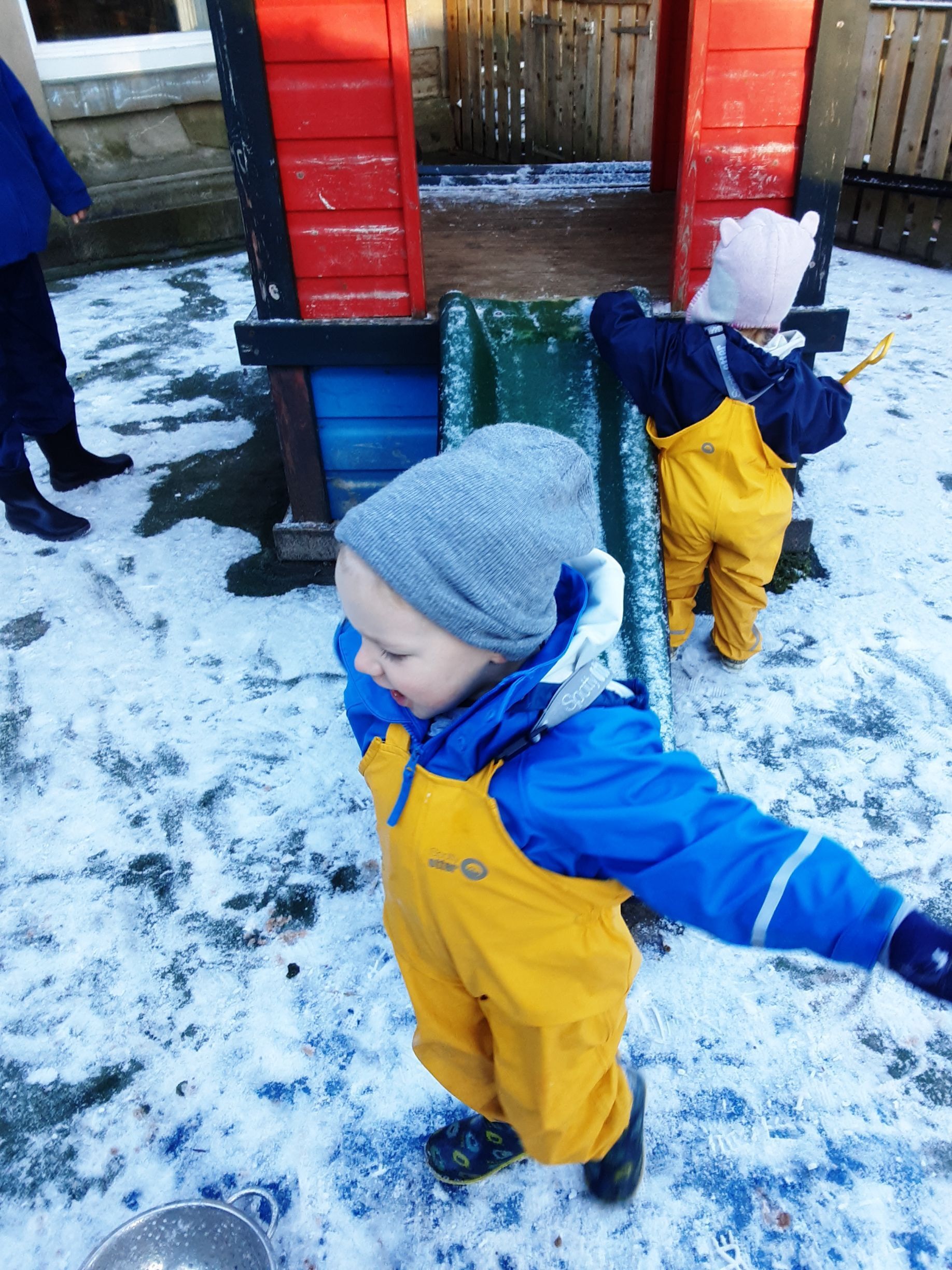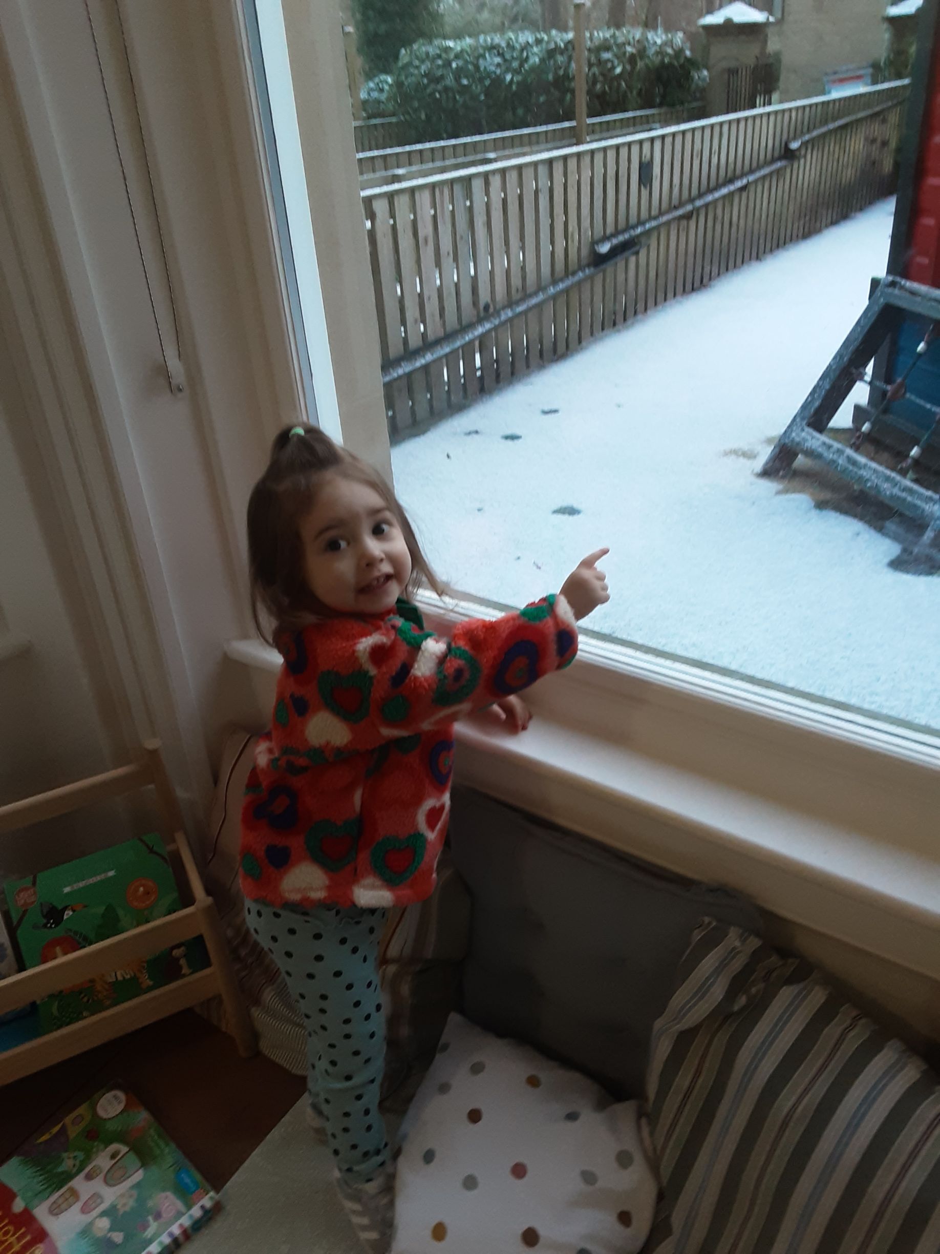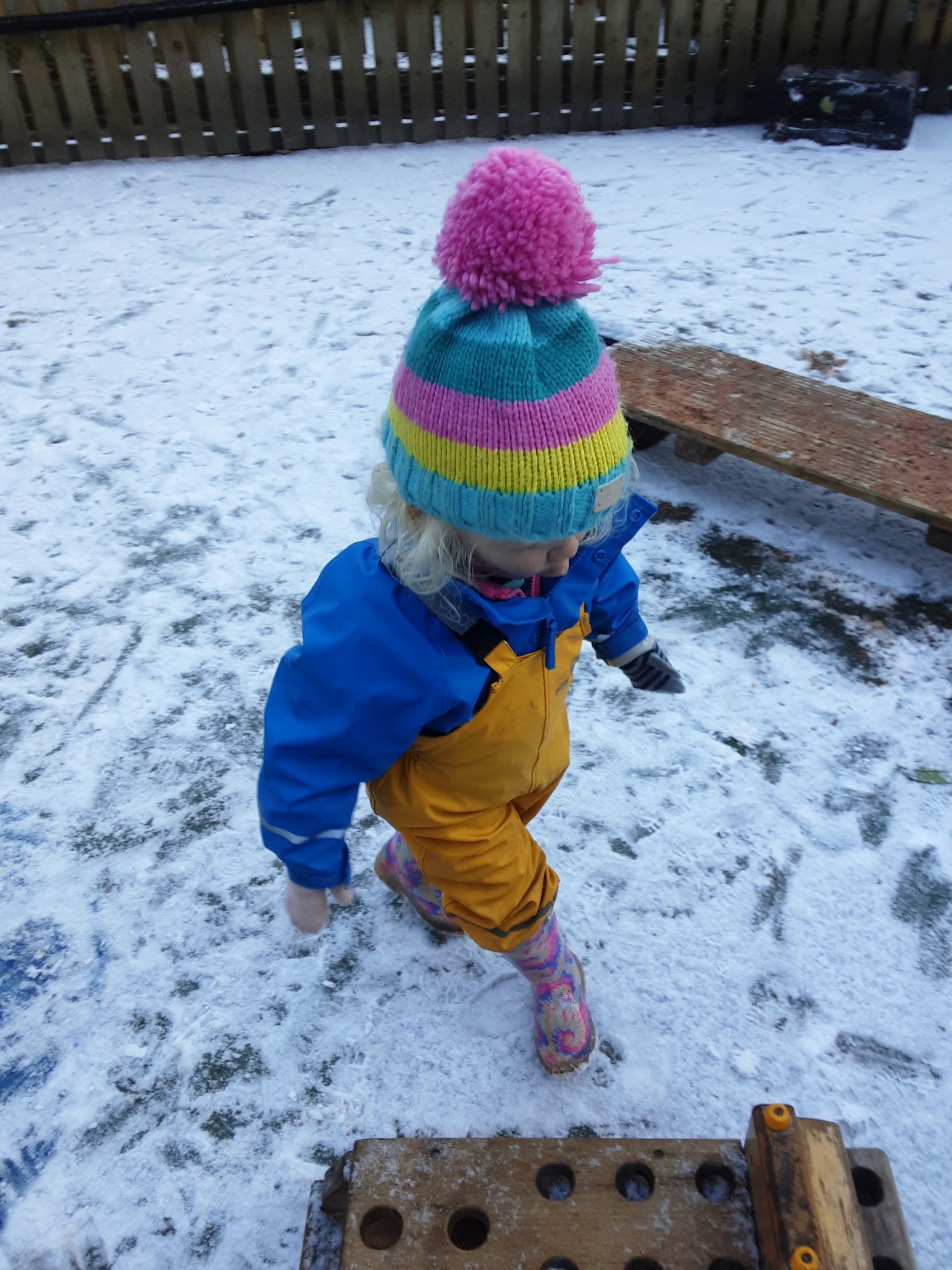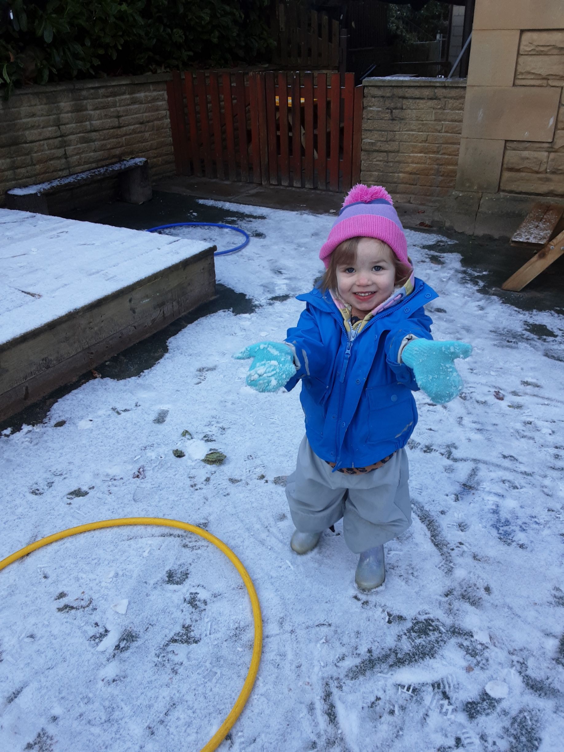 We wrapped up warm and went out to explore it scooping it into piles and throwing it into the air. We had lots of fun making snow prints in the snow and talking about snowflakes falling.