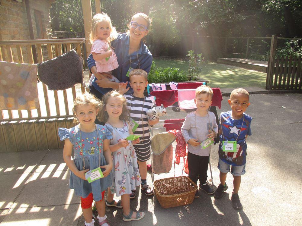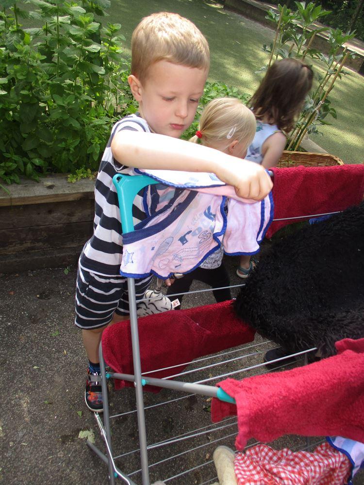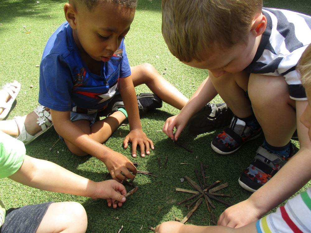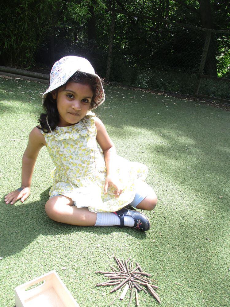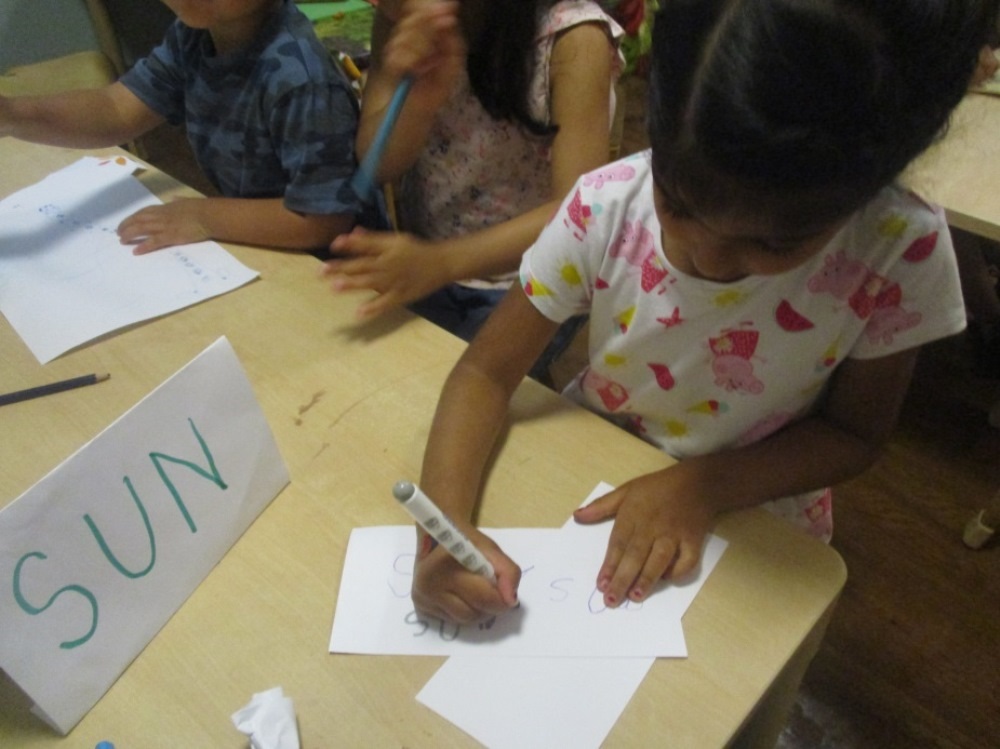 Instead of using the laundry dryer, children had a lot of fun hanging nursery’s laundry on the drying rack and asking lots of questions about sun. They were all so excited so we decided to carry on with more activities. Some of the children lay down on the grass composing a circle representing sun, and some others created their own sun by using natural resources they collected from the forest. To extend our preschool children’s learning we encouraged them to read the word ‘sun’ and practice their writing skills by copying the word ‘sun’.