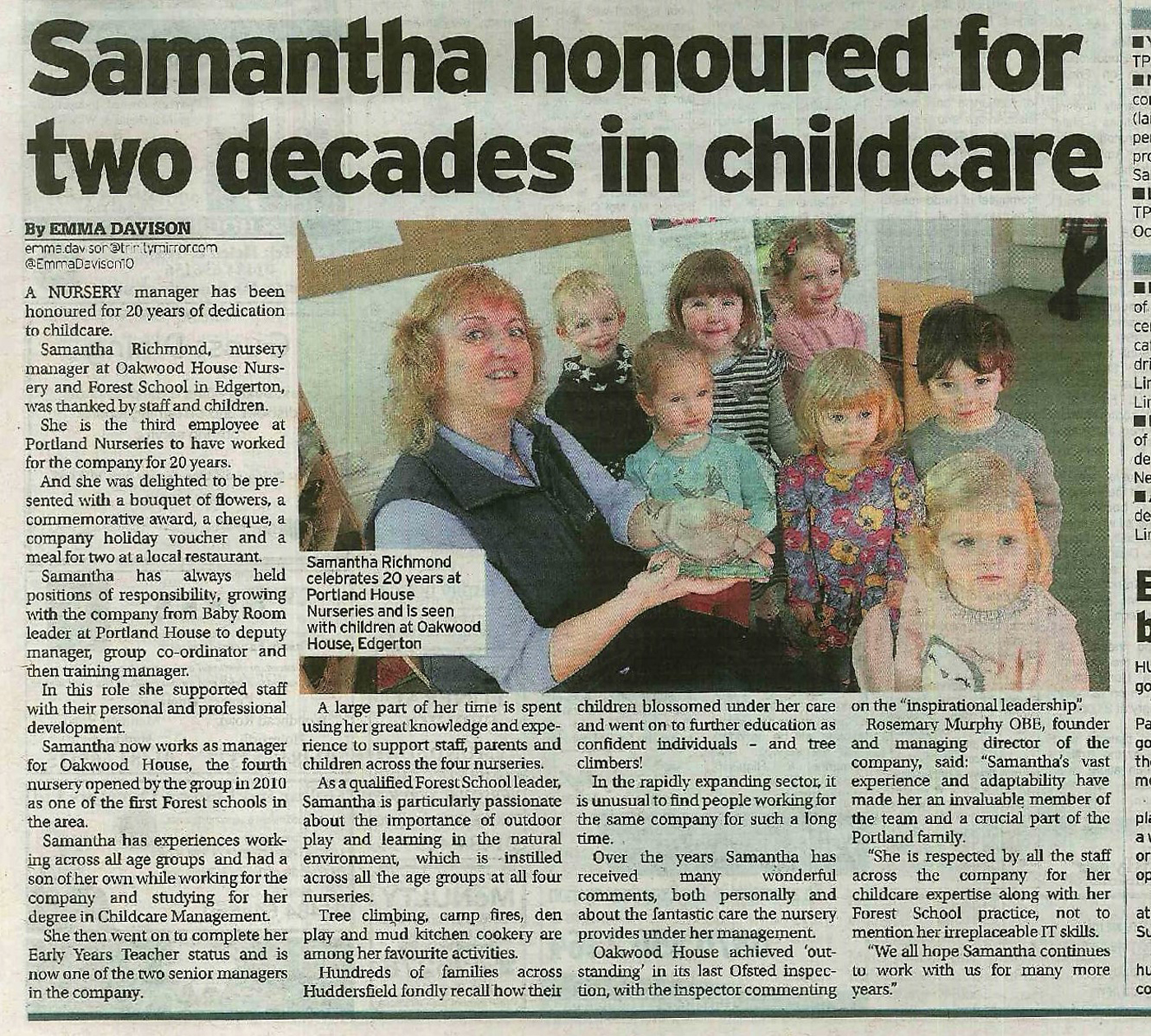Staff and children gathered last week at Oakwood House Nursery & Forest School, to congratulate nursery manager Samantha Richmond for her twenty year contribution to making Huddersfield based Portland Nurseries group “Outstanding”. Samantha is the third employee at Portland Nurseries to have worked for the company for twenty years and she was presented with a beautiful bouquet of flowers, a commemorative award, a cheque, a company Holiday Voucher, and a meal for two at a local restaurant.