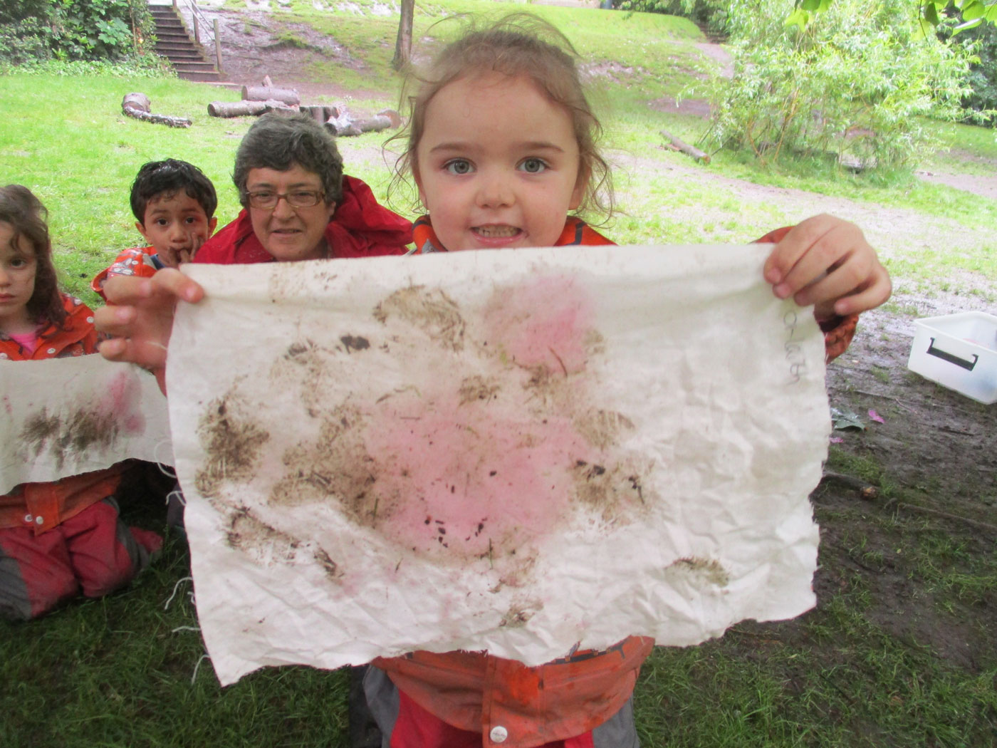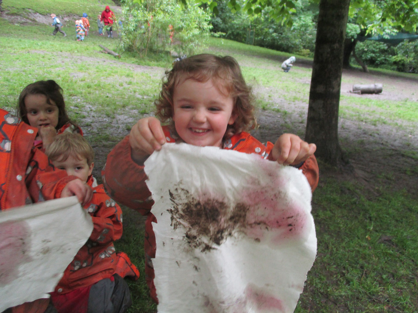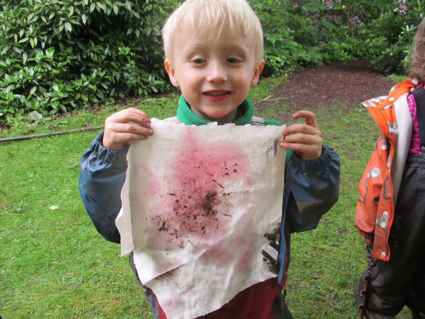 They were amazed to see colour appear on their materials with only the use of flowers, leaves, berries and mud and showed such pride in their finished piece. As the rain began to pour we took shelter in our emergency shelter and enjoyed tea outside.