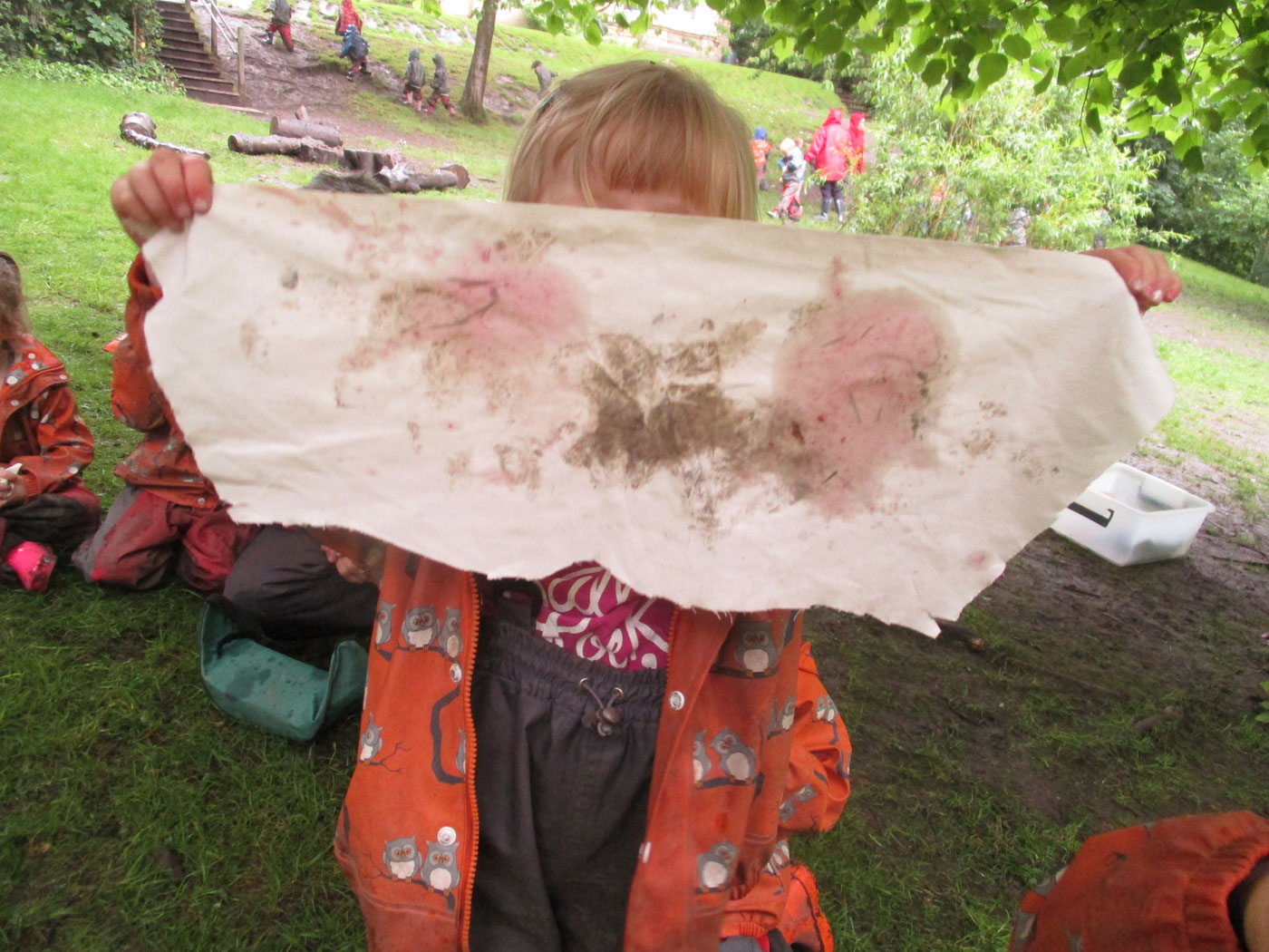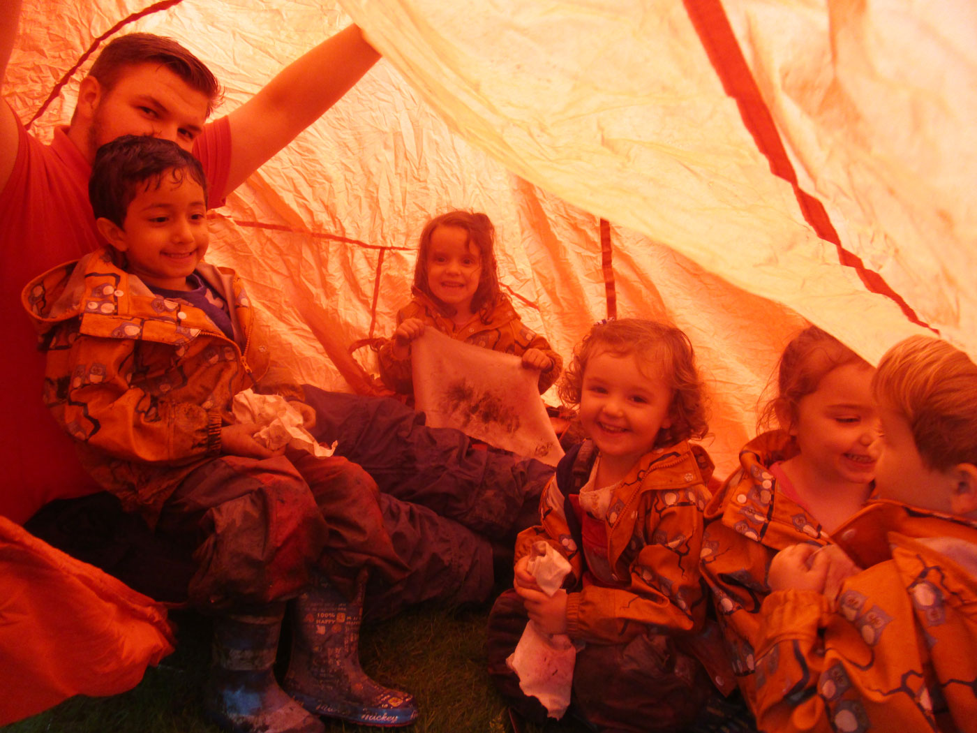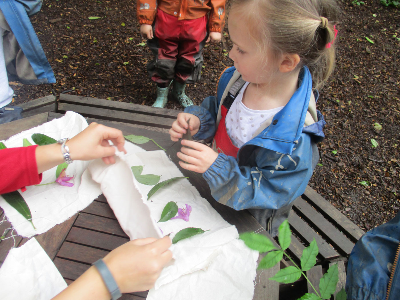 They were amazed to see colour appear on their materials with only the use of flowers, leaves, berries and mud and showed such pride in their finished piece. As the rain began to pour we took shelter in our emergency shelter and enjoyed tea outside.