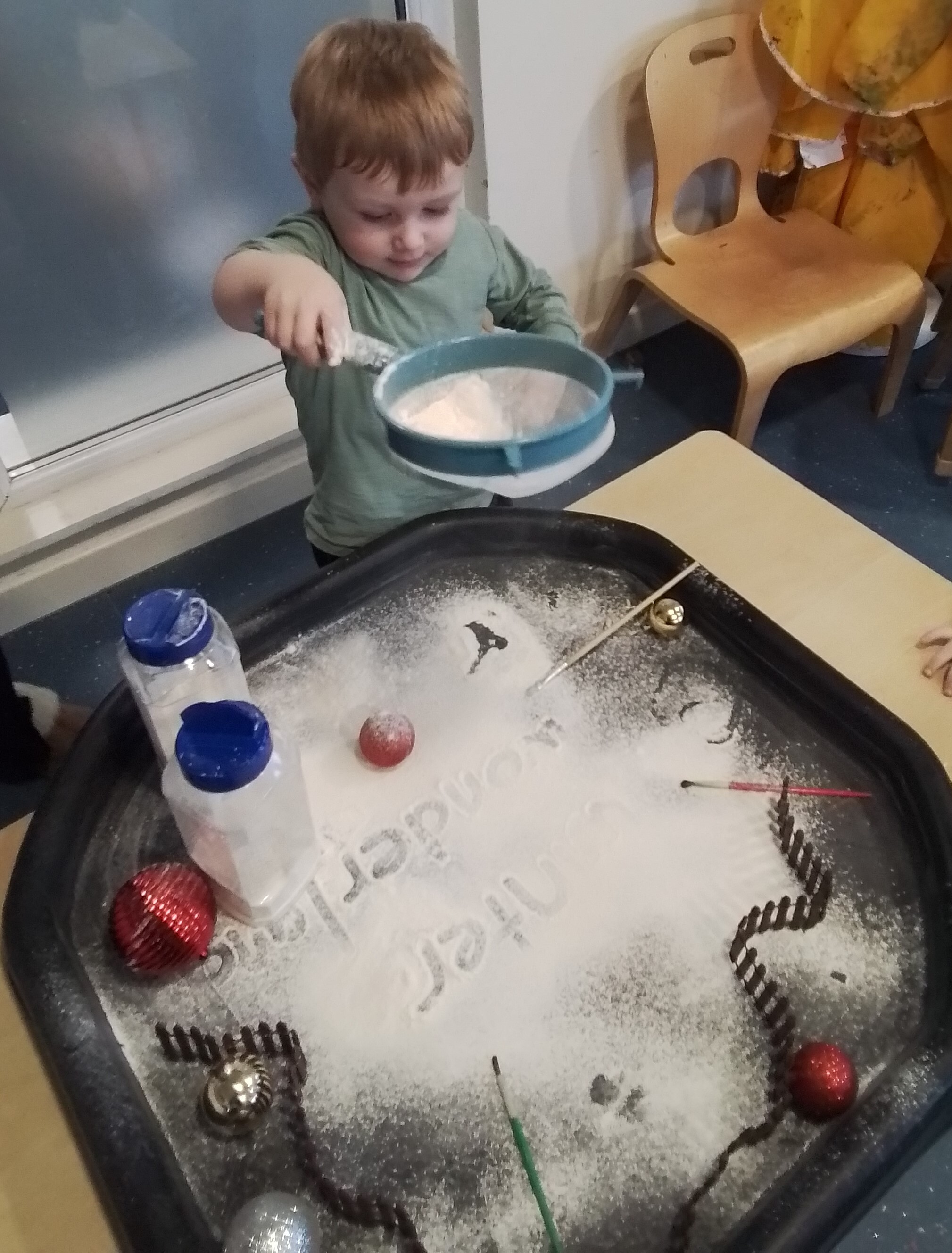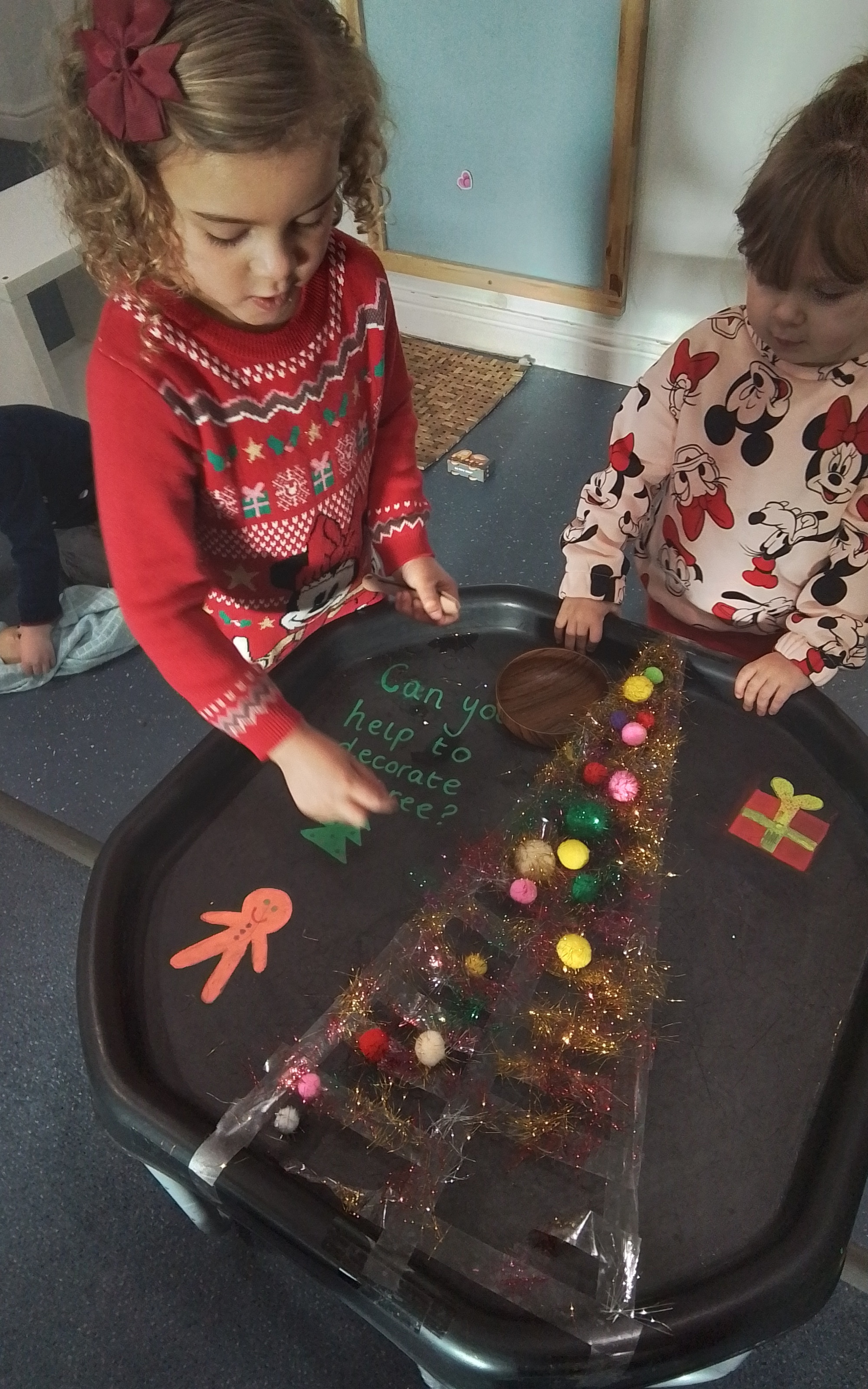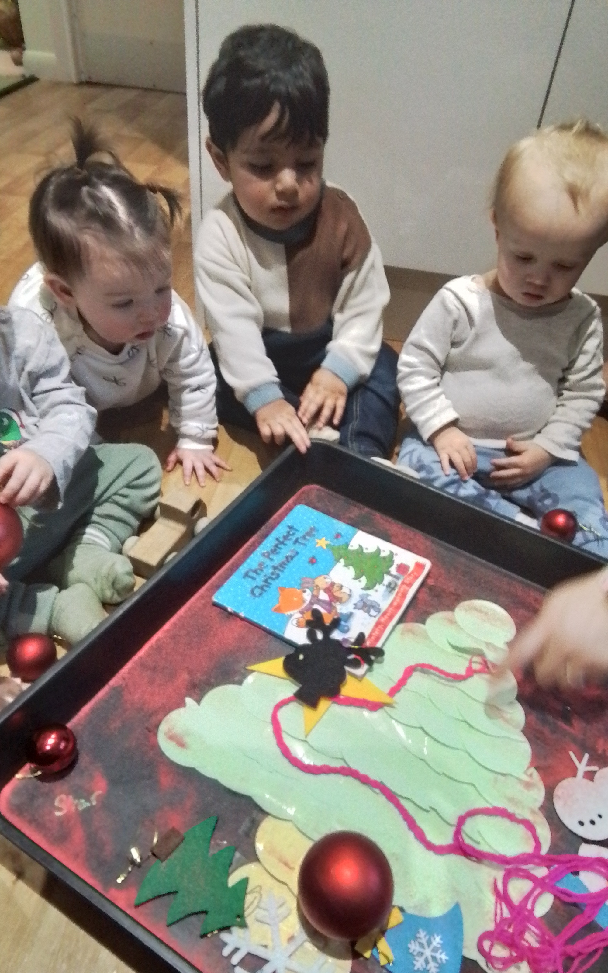 Preschool Children are at the very start of their school readiness journey and what fantastic progress they are making so far. They are now able to follow simple instructions in cooking club as they learn how to weigh, measure and use equipment safely. We have been enjoying our weekly language class, learning colours in French, how to say simple things such as 'goodbye, thank you, see you soon. ' We have learnt our colours and have been praising each other when they have tried exceptionally hard and awarded “star of the day”. Toddlers Our resilience and independence is flourishing as we get ready to go and play outside, we can dress ourselves, we can find our own wellies most of the time and can put our hats on the correct way around. Toddlers are developing their understanding of boundaries and how to play in small groups, taking turns with each other and are increasingly adding more words to sentences to make their understanding clear to others. We have been learning about lots of different celebrations, we have incorporated our love for STEAM when learning about Hanukkah and Christmas, practising our fine motor skills when decorating the Christmas tree with baubles and using pom poms to decorate a candelabrum. Babies As the older babies get ready to move downstairs they have been supported through the independence skills needed in the curriculum to prepare them for the transition to the toddler room. We have been practising using our own spoons at lunch time and introducing a fork. The younger babies are now mastering the skill of an open cup and managing not to spill when they have a drink. Babies show a love for singing and introducing their vocabulary, in particular using the singing spoons and starting to recognise familiar songs through objects of reference. We have been using the opportunity to be creative when learning about celebrations and festivals encouraging fine motor skills and the effects of using purposeful movements to make marks.